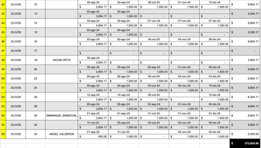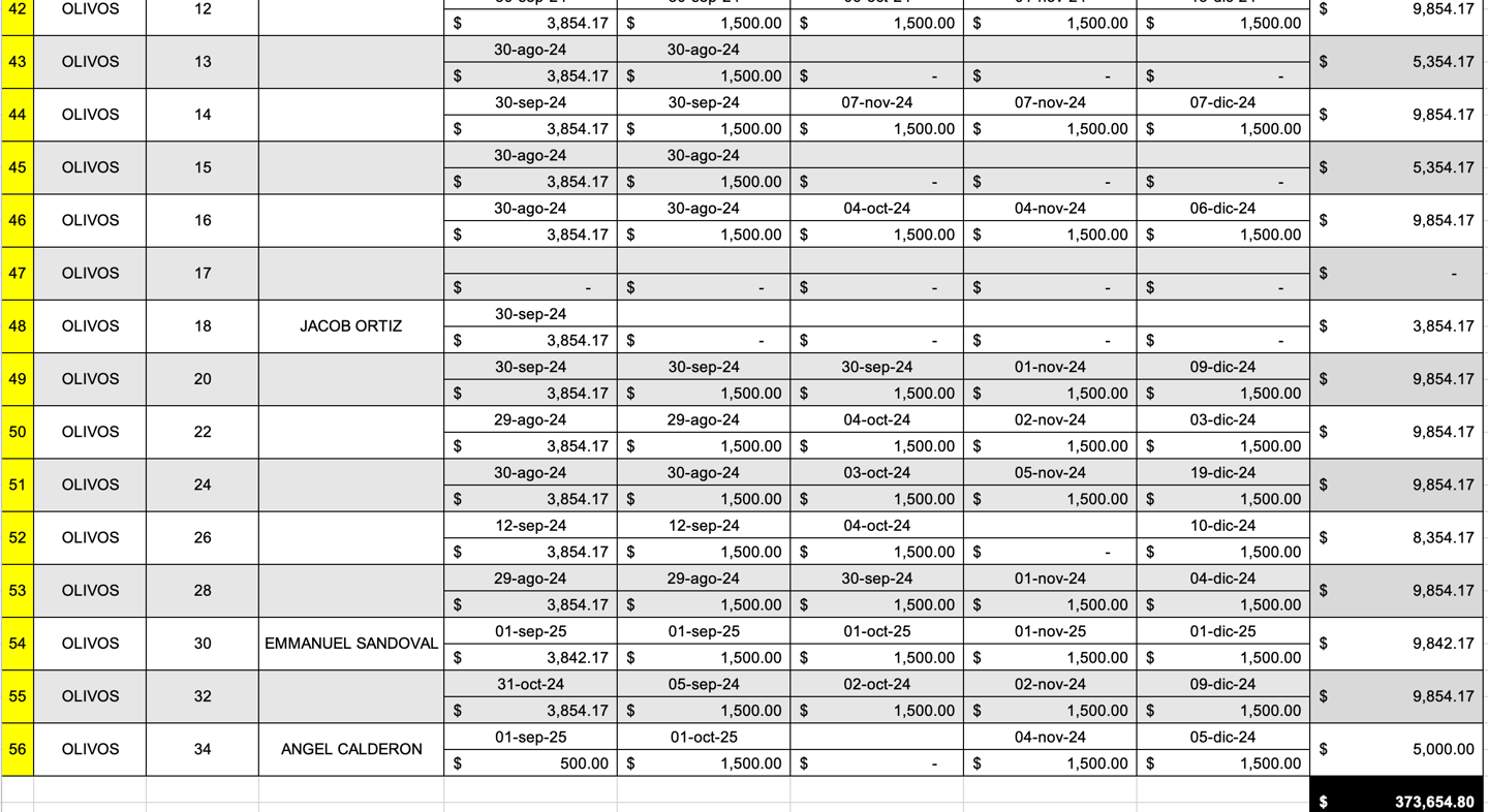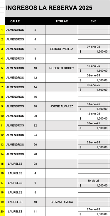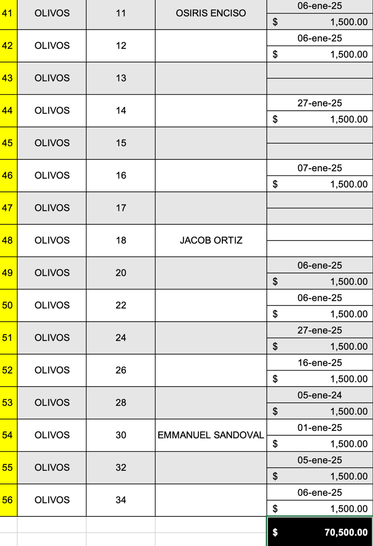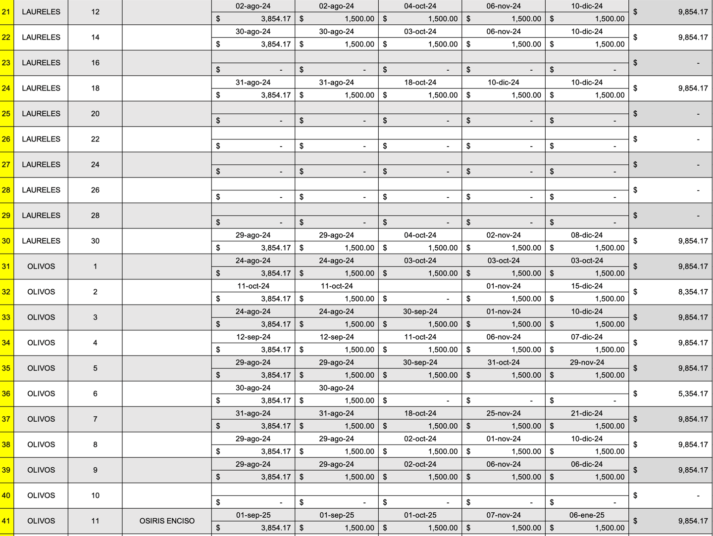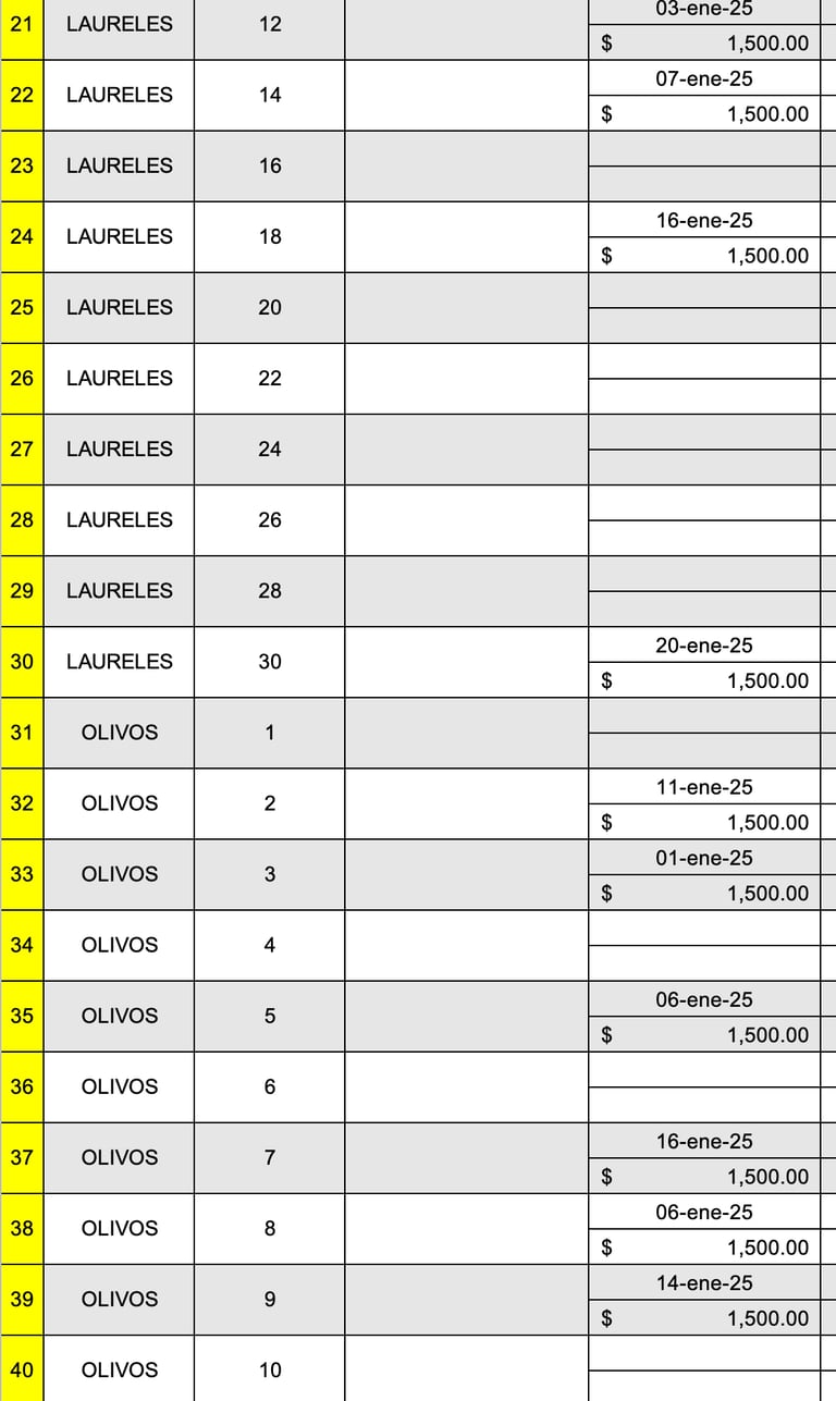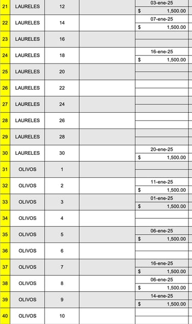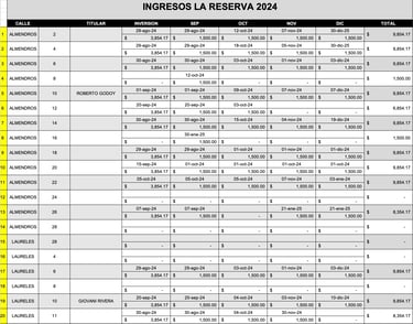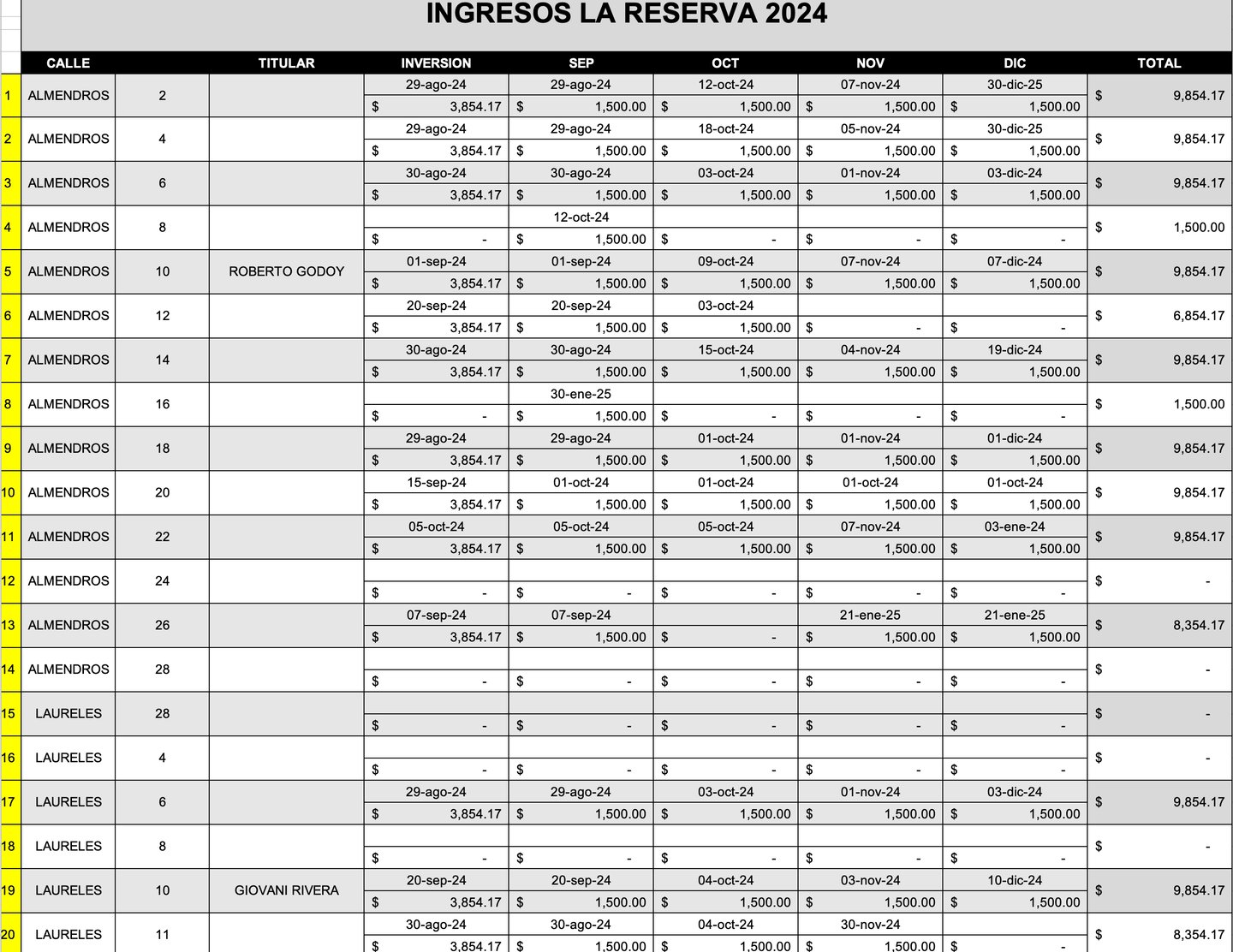 Hasta la fecha, se han realizado gastos por un total de $366,558.43 MXN, cubiertos con las aportaciones de los vecinos mismos que iremos identificando con nombre por casa para una mejor identificación de sus abonos. A continuación, presentamos un desglose detallado de estas aportaciones, especificando los montos correspondientes a cada vivienda durante el periodo 2024-2025 tomando como relación desde agosto 2024 que empezamos con las cuotas a la fecha: