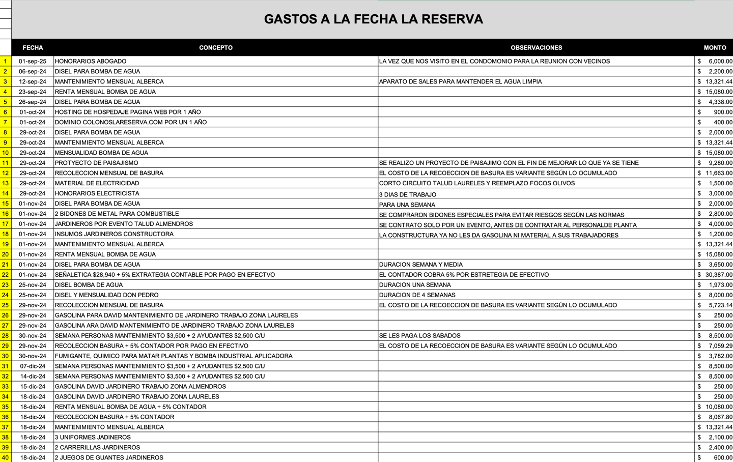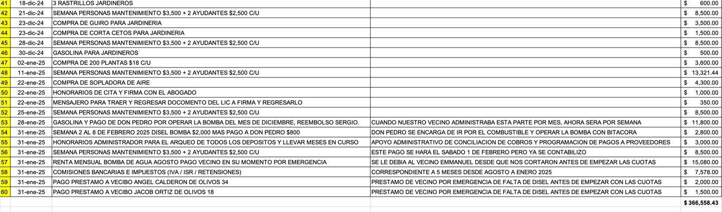 Hasta la fecha, se han realizado gastos por un total de $365,558.43 MXN, cubiertos con las aportaciones de los vecinos.