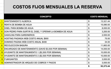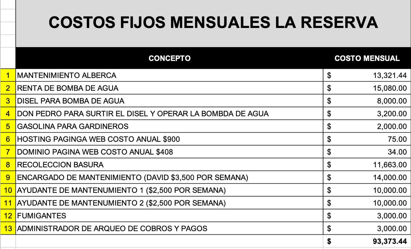 A continuación, les presentamos los costos fijos de cada servicio que se ha estado pagando. Es importante mencionar que, además de estos gastos recurrentes, se han realizado inversiones adicionales en equipos necesarios para el mantenimiento del condominio, como herramientas para el corte de pasto, carretillas y uniformes, entre otros. Estos gastos estarán detallados al final de esta rendición de cuentas, junto con otros imprevistos que han surgido en el proceso.