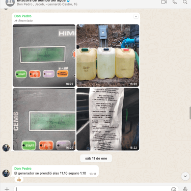 Para mayor transparencia y control, se creó un grupo de WhatsApp donde diariamente se informa la hora de encendido y apagado de la bomba, el nivel de combustible, las notas de consumo de la gasolinera y fotografías de los bidones. Gracias a esta organización, hemos logrado minimizar los problemas de abastecimiento de agua en el condominio.