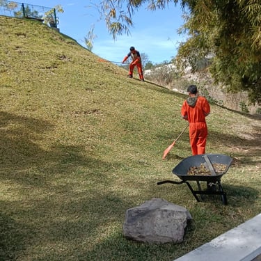 El personal contratado cuenta con uniformes de color naranja para diferenciarlos de los trabajadores de la Constructora que aún están presentes. Que por cierto ya son casi nulos. También se les proporcionaron guantes de protección y herramientas como carretillas, rastrillos de jardín, fumigantes químicos y una bomba fumigadora industrial. Esta última se adquirió tras un incidente en el que uno de los trabajadores fue picado por una araña, lo que nos alertó sobre la alta cantidad de arañas que estaban ocultas en la maleza. Afortunadamente, no pasó a mayores, pero si estuvo malo un par de dias, por eso reforzamos las medidas de seguridad para evitar futuros riesgos para ellos.