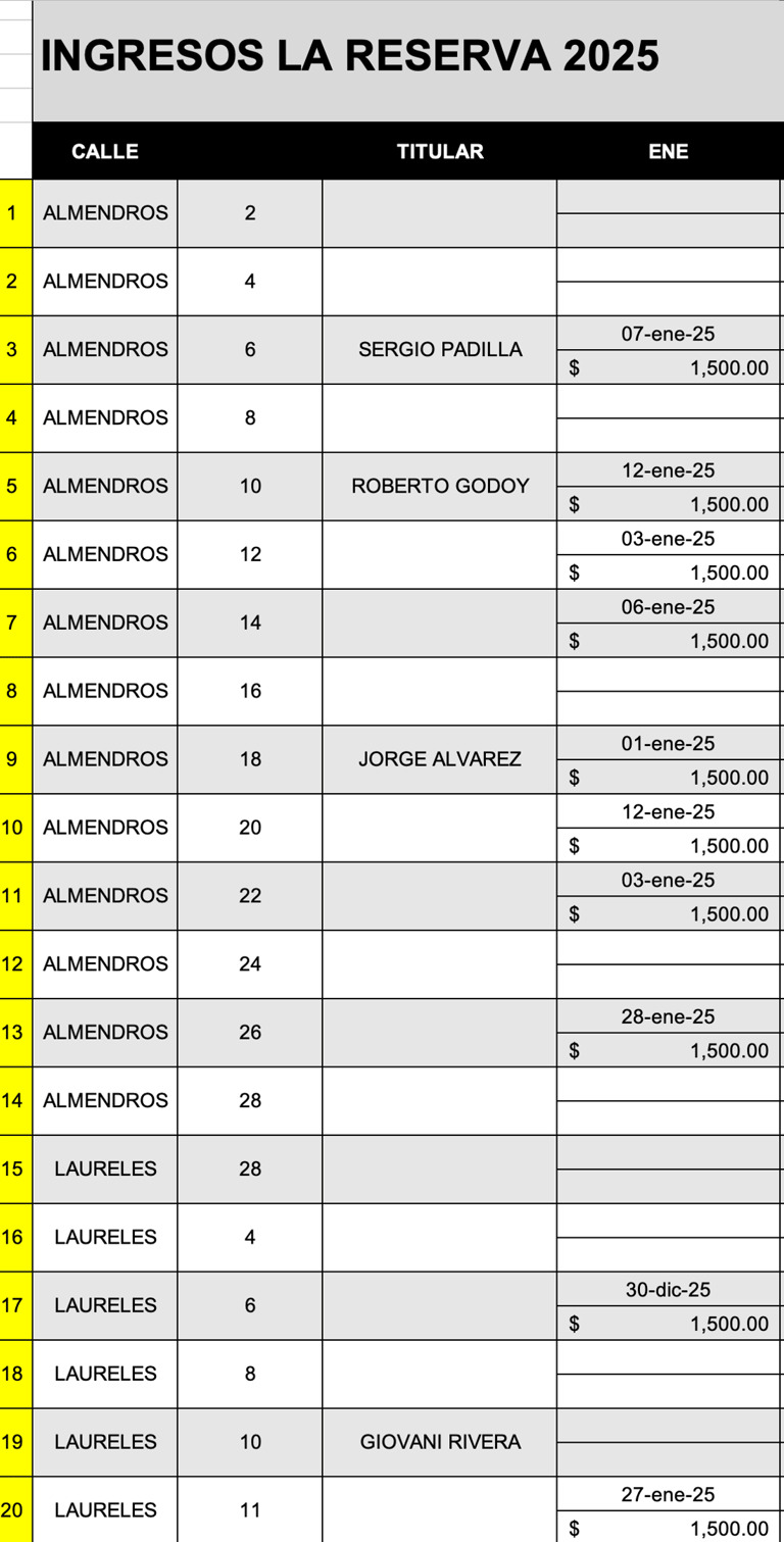 Es importante mencionar que el vecino de la casa 20 de calle Almendros adelantó sus cuotas de enero a diciembre de 2025. Su aportación no se refleja en la imagen, pero sí está incluida en el total recaudado.